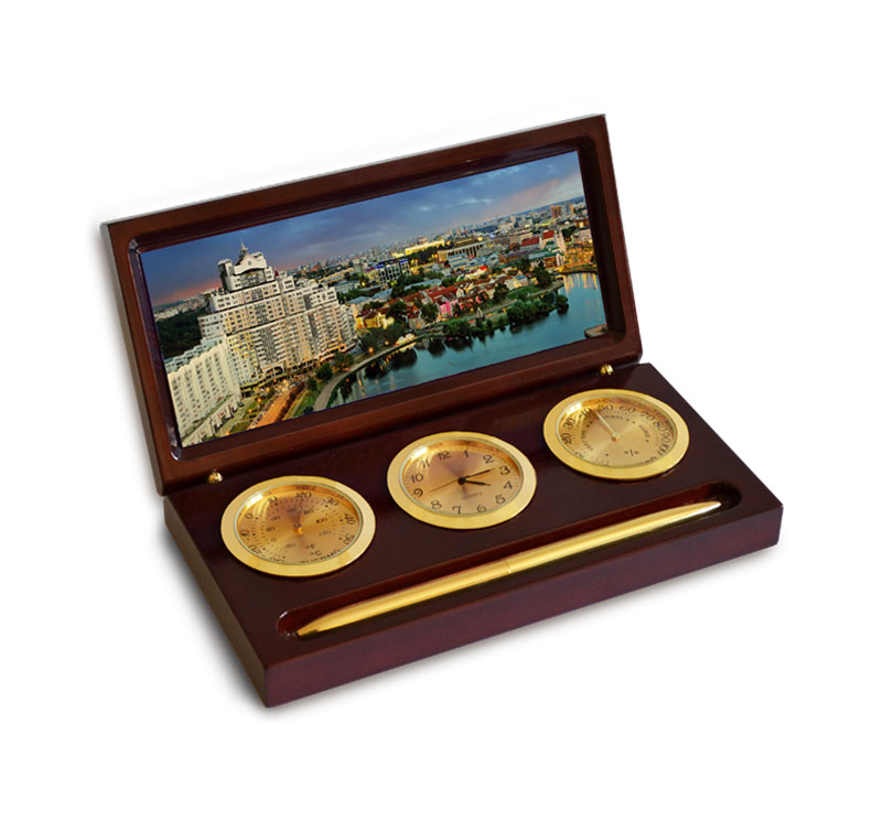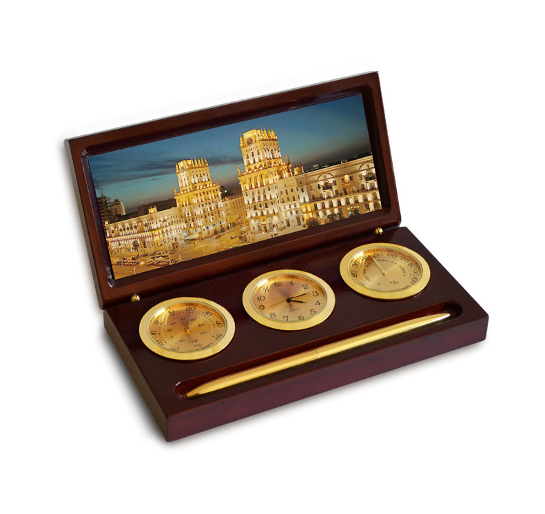 Метеостанция "Традиция" изготовлена из натурального дерева. В комплект входят часы, гигрометр и термометр. На верхней части изделия нанесен герб Республики Беларусь с использованием технологии лазерной гравировки по дереву с напылением «под золото». Эта настольная метеостанция станет хорошим подарком для руководителя или коллеги. Оригинальный, неповторимый и престижный подарок.
