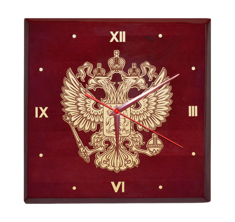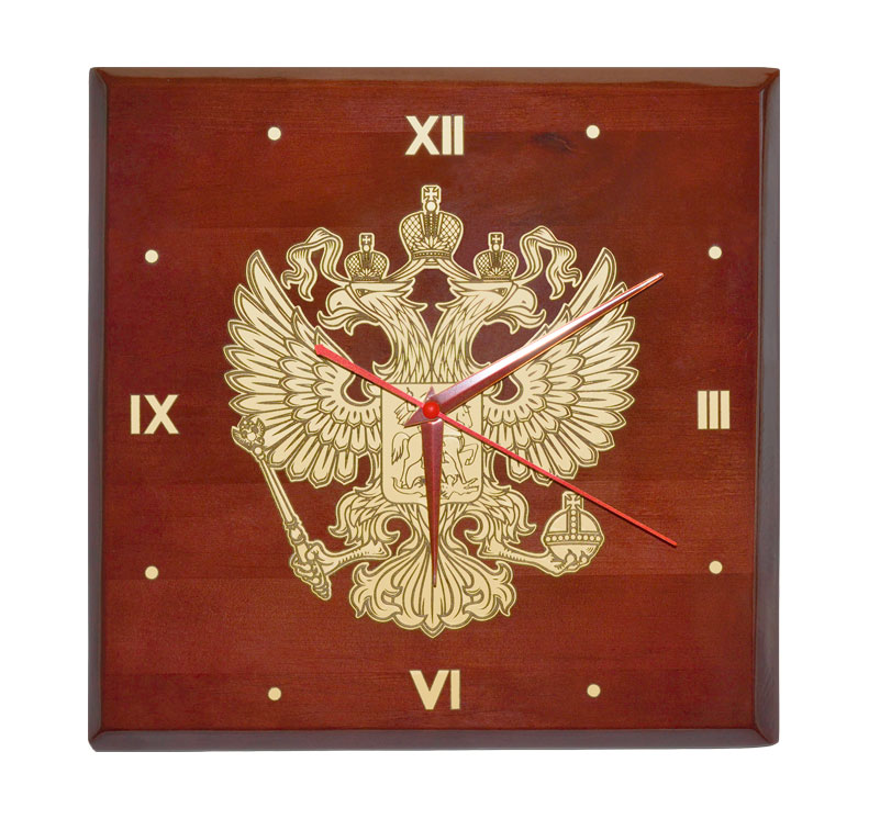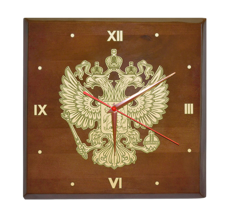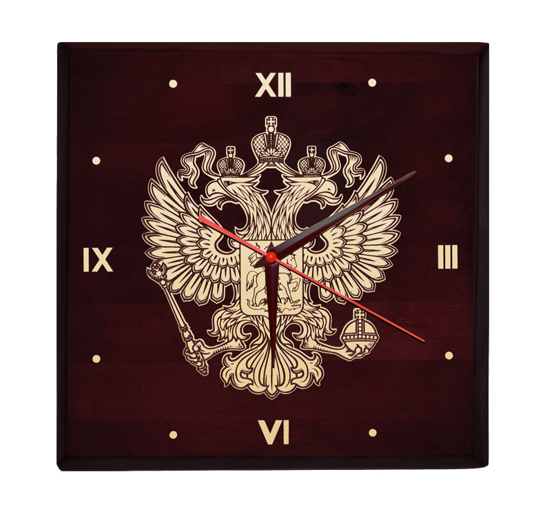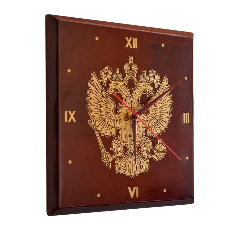 Уникальные сувенирные настенные часы, изготовленные из натурального дерева с кварцевым механизмом. На часы нанесен герб России с использованием технологии лазерной гравировки по дереву с напылением «под золото». Эти настенные часы будут идеально вписываться в интерьер вашего дома или офиса. Оригинальный, неповторимый и престижный подарок.