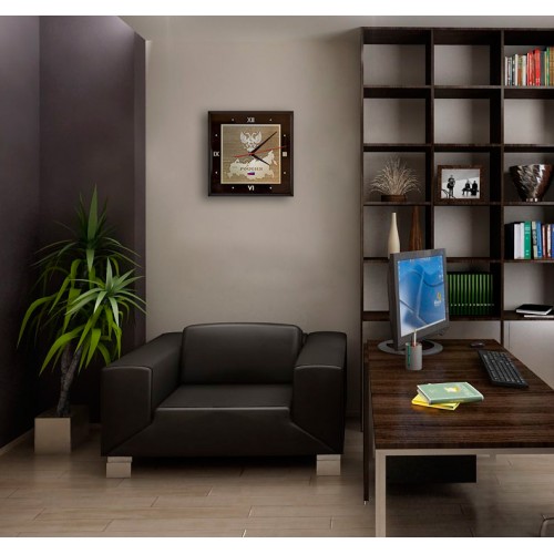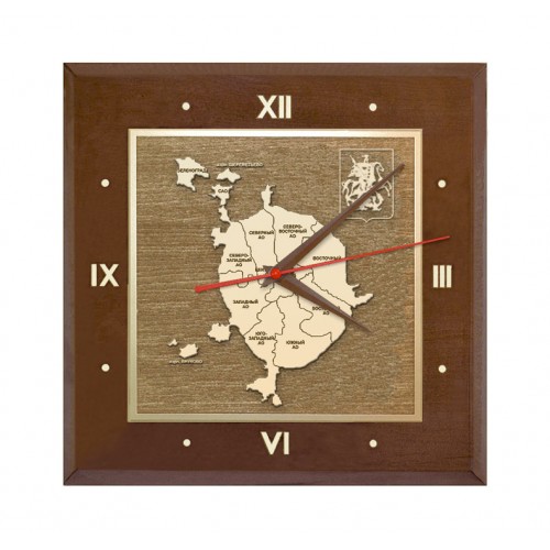 Настенные деревянные часы «Карта Москвы с гербом» кварцевые. Изображение символики Москвы (карты и герба) на стильных часах на стену выполнены методом гравировки по дереву и напылением «под золото». Оригинальные офисные часы на стену станут отличным дополнение интерьера кабинета руководителя. Эксклюзивный и функциональный сувенир.