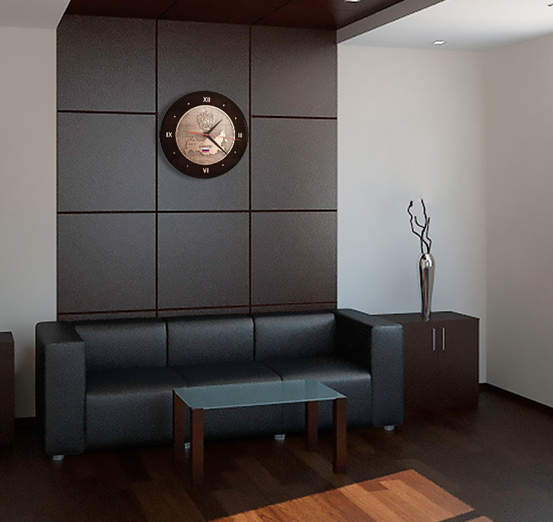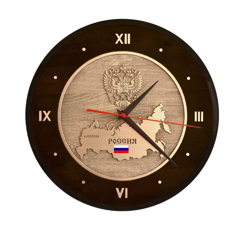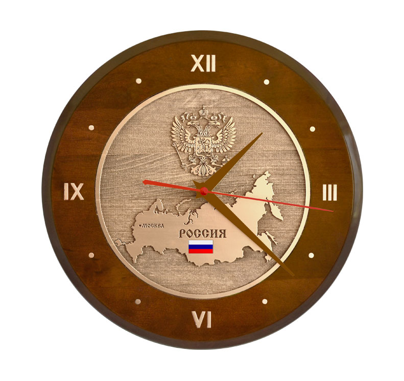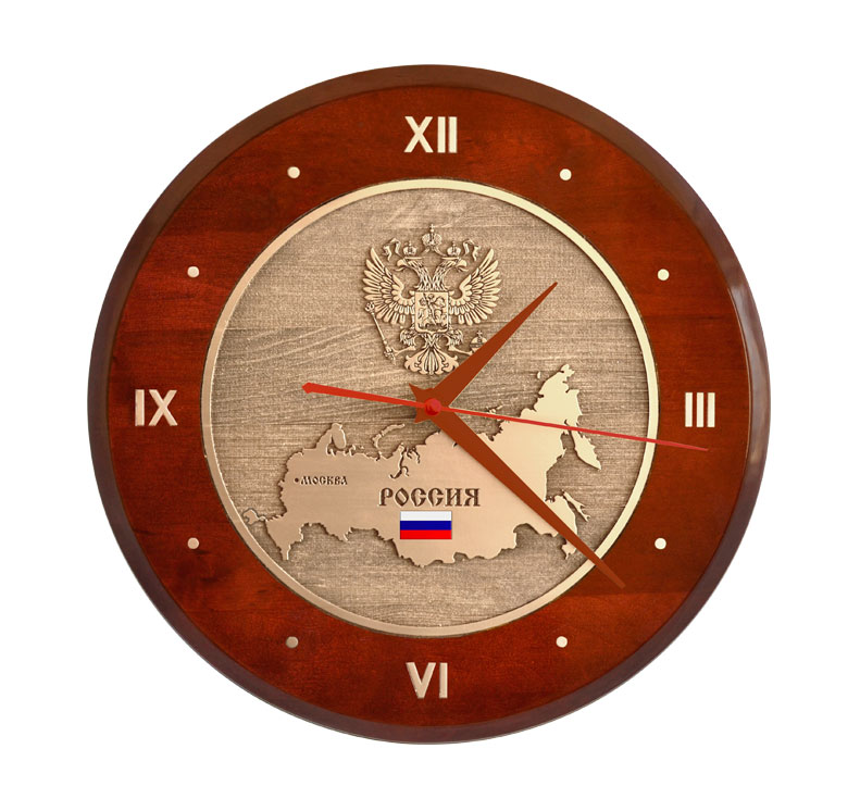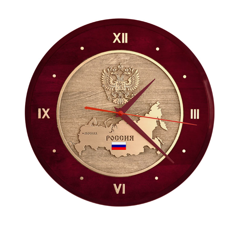 Уникальные сувенирные настенные часы, изготовленные из натурального дерева с кварцевым механизмом. На часы нанесены карта, флаг и герб России с использованием технологии лазерной гравировки по дереву с напылением «под золото». Эти настенные часы будут идеально вписываться в интерьер вашего дома или офиса. Оригинальный, неповторимый и престижный подарок.