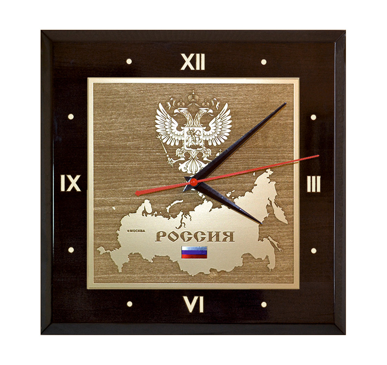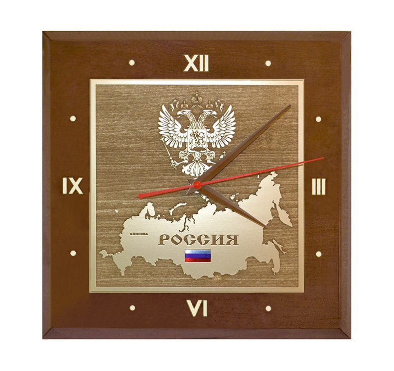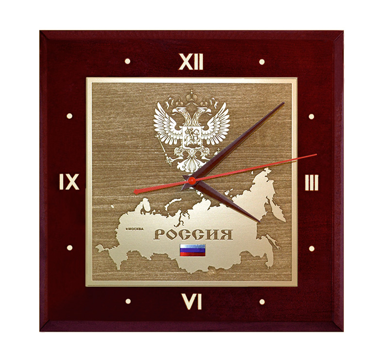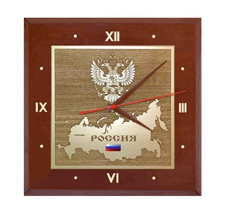 Уникальные сувенирные настенные часы, изготовленные из натурального дерева с кварцевым механизмом. На часы нанесены карта, флаг и герб России с использованием технологии лазерной гравировки по дереву с напылением «под золото». Эти настенные часы будут идеально вписываться в интерьер вашего дома или офиса. Оригинальный, неповторимый и престижный подарок.
