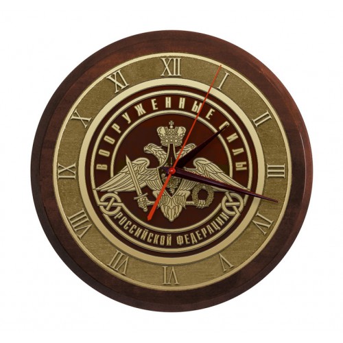 Дизайнерские деревянные часы на стену «ВС РФ» кварцевые. Изображенная на циферблате часов символика Вооруженных сил и герба Российской Федерации изготовлены с использованием гравировки по дереву и покрыты золотой патиной. Такие стильные деревянные часы настенные – эксклюзивный и оригинальный сувенир.