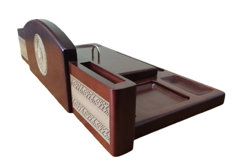 Уникальный настольный письменный набор «Консул», изготовленный из натурального дерева с нанесением герба Республики Беларусь с использованием технологии лазерной гравировки по дереву. Герб изготовлен с напылением «под золото». Этот письменный набор будет идеально вписываться в интерьер рабочего стола руководителя и подчеркнет высокий статус его владельца. Оригинальный, неповторимый и престижный подарок.